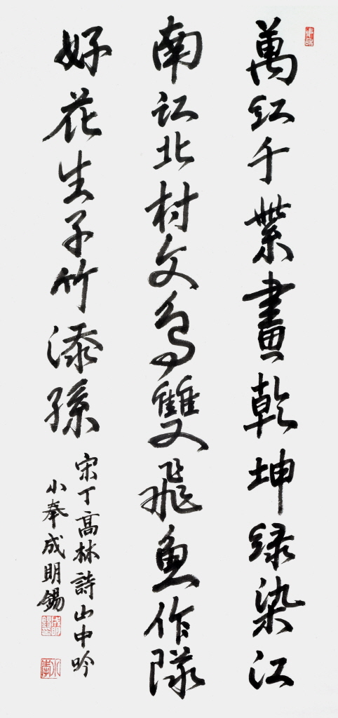 | 작품설명 | 울긋불긋한 빛깔로 온 세상그리니 강남과 강북의 마을 녹색으로 물드네 문조는 쌍으로 날고 물고기는 무리 짓는데 좋은 꽃은 열매 맺고 대나무는 자손을 더하네 |