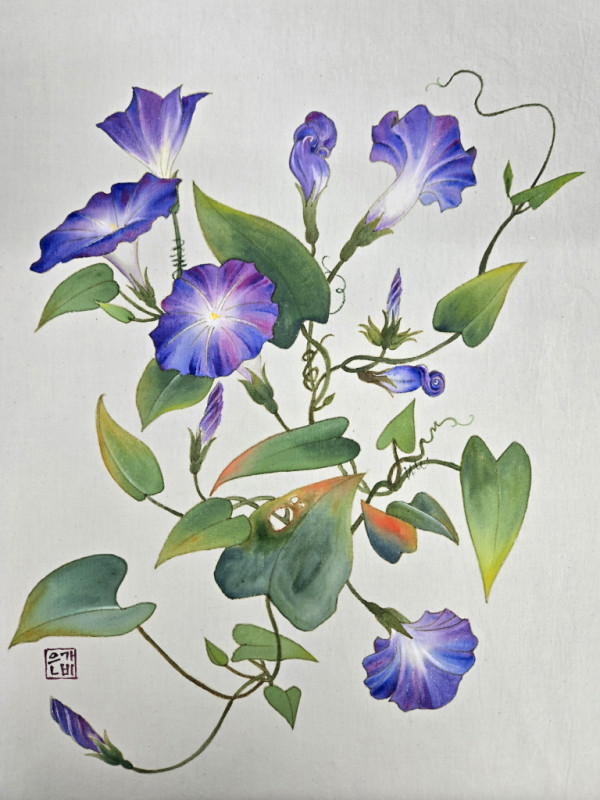 | 작품설명 | 이 작품은 화려한 색채와 경쾌한 붓 터치가 돋보이는 그림입니다. 연보라색 배경 위에 다양한 들꽃들이 풍성하게 담겨 있습니다. |