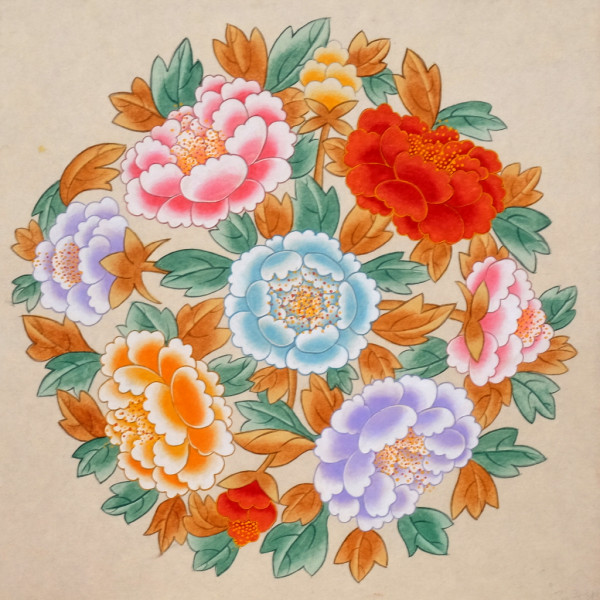 | 작품설명 | 이 작품은 옻지에 분채로 그린 민화 작품으로, 부귀영화를 상징하는 모란꽃이 둥근 원형을 이루며 화려하게 피어 있는 그림입니다. '복덩이 모란'이라는 제목처럼, 풍요와 행복이 덩어리처럼 모여 있는 모습을 표현하고 있습니다. |