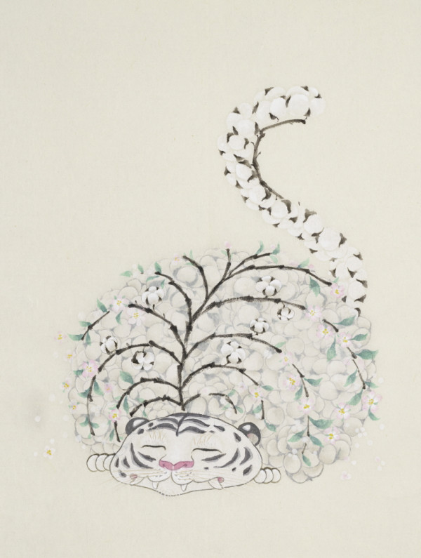 | 작품설명 | 혼례를 마친 신부의 가마에는 호랑이 가죽을 덮고, 방석 밑에는 목화씨를 두었다고 한다. 액을 막고, 자손의 번창을 바라는 마음이 담긴 풍습이다. 이 오래된 풍습을 바탕으로, 호랑이의 줄무늬를 가지 삼아 목화씨가 꽃을 피우는 상상을 형상화했다. 삶의 거친 결 속에서 피어나는목화꽃은 평탄하고 다복한 삶에 대한 소망을 품고 있다. 이는 우리 모두가 평안하고 행복한 삶을 향해 나아가길 바라는 마음의 염원을 의미한다. |
