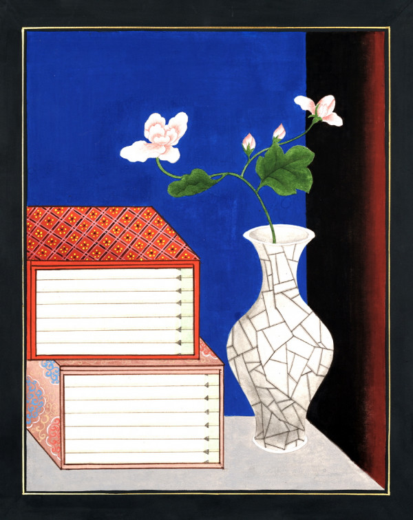 | 작품설명 | 조선시대 책가도를 차용하여, 책갑의 단정한 직선과 꽃의 유려한 곡선을 함께 담았습니다. 작가는 이 두 요소의 어우러짐에서 아름다움을 느끼며 작업하였고, 화면은 고요하면서도 생동하는 조화를 보여줍니다. 전통적 구도 속에서 꽃은 삶의 기운과 새로운 이야기를 상징합니다. |
