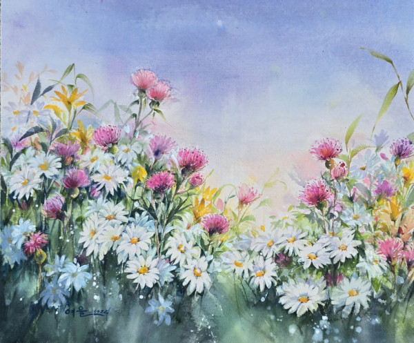 | 作品説明 | 白い野菊、ピンク色のアザミ、黄色い花など、さまざまな野の花が調和して咲いています。繊細でありながら自由な筆致が野の花の生き生きとした様子を巧みに表現しており、特に絵具がにじむような技法が作品に幻想的な雰囲気を加えています。 |