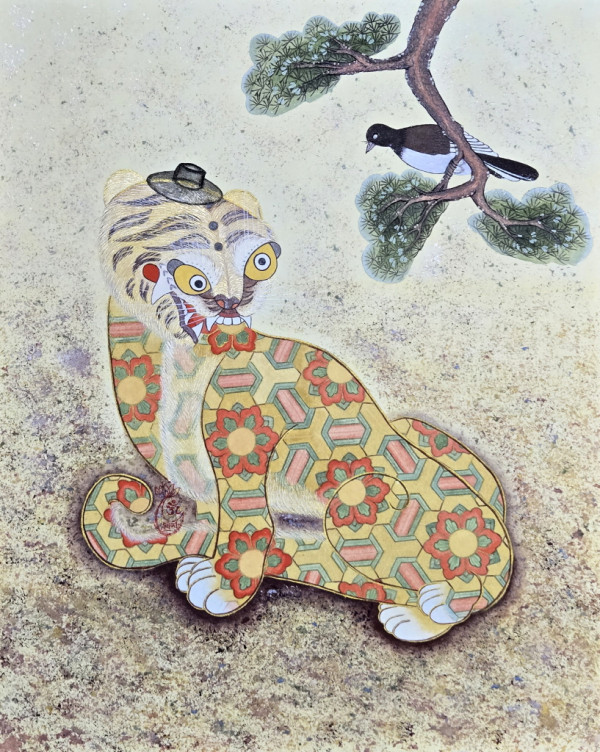 | 作品説明 | 「丹青虎鶴図(たんちょうこかくず)」は、 韓国人にとって最も親しみのある民画の題材に、 仏教美術の精髄である丹青(タンチョン) を融合させた作品です。ユーモラスな美しさとともに、 宗教的な神聖さをも感じさせる非常に独創的な絵 |