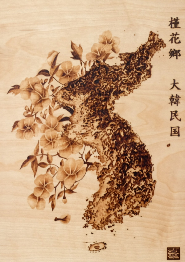 | 作品説明 | 木の板の上に、はんだごてのような熱い道具で絵を描くウッドバーニング(パイログラフィ)技法によって制作された芸術作品です。 ウッドバーニング特有の温かく自然な色合いの中で、大韓民国のアイデンティティを非常に美しく、そして象徴的に表現しています。 |