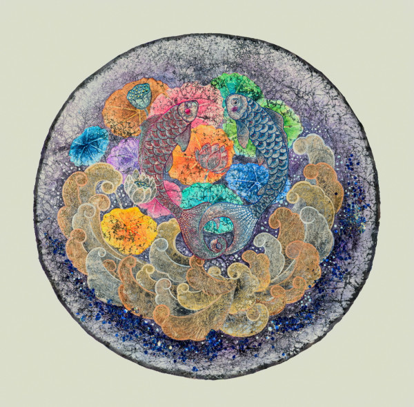 | 作品説明 | 君と僕(きみとぼく) 蓮の花と葉の間をゆったりと泳ぐ二匹の魚は、 異なるようで似ている「君」と「僕」の姿を映しています。 蓮の花は清らかさを、蓮の葉は包み込む豊かさを、 そして魚は豊穣と調和を象徴します。 共に在り、共に寄り添うその姿に、 ささやかだけれど深い幸せが咲き誇ります。 |