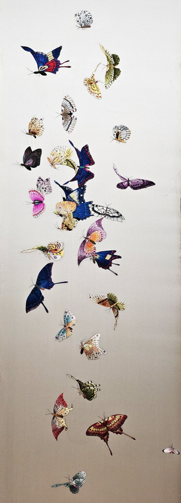 | 作品説明 | この作品の主なモチーフである蝶(ちょう)は、 古くから韓国伝統美術において夫婦の和合、 喜び(喜)、長寿(寿)を象徴する吉祥の 意味を持っています。特に、「群蝶図」は 多数の蝶が一堂に集まり飛び回る姿を通して、 家の繁栄と絶え間ない慶事を願う意味が込められています。 |