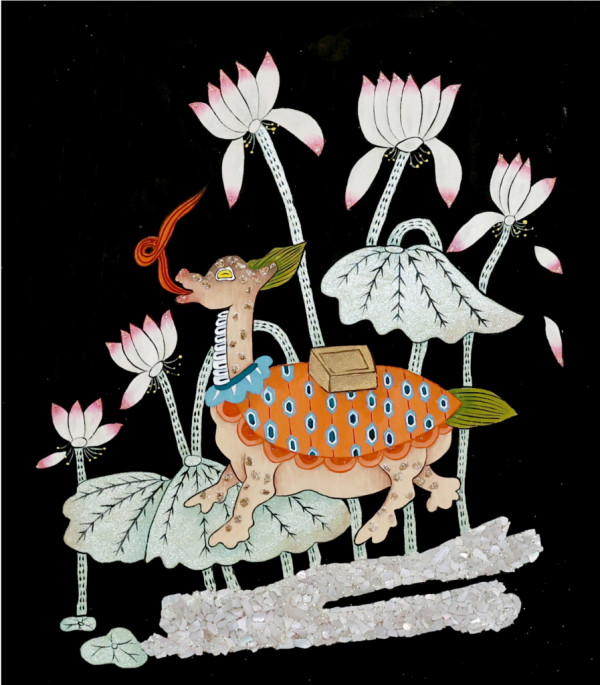 | 作品説明 | 「瑞獸樂園圖」は、伝統民画の象徴的な世界を**螺鈿(らでん)**という華やかな伝統工芸技法で再創造した、非常に独創的な作品です。 **長寿と安定(亀)、強い力(龍)、そして清らかな豊かさ(蓮)**が満ちた永遠の楽園(貝の光)を夢見る作家の願いが込められています。 |