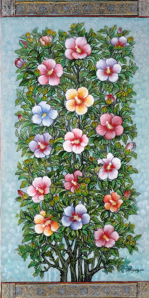 | 作品説明 | はい、承知いたしました。提供された文章を日本語に翻訳します。 絶え間なく咲き続ける花のように永遠に繁栄し、皆が調和して生きる美しい世界への願いが込められています。 この作品は、韓国の象徴であるムクゲ(槿、むくげ)を現代的な美意識と独創的な技法で再解釈し、その内に秘められた強靭な生命力と和合の精神を視覚的に美しく具現化した絵画です。伝統的な題材に新しい命を吹き込み、観る者に誇りと希望のメッセージを感じさせる、印象深い作品で |