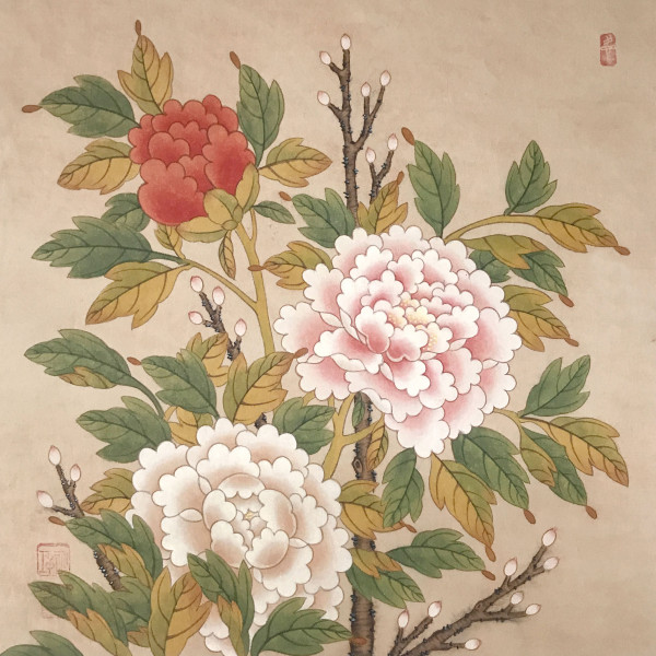 | 作品説明 | 牡丹図(ぼたんず)は民画(みんが)において最も代表的な花を描いた絵であり、「花中之王」(かちゅうのおう)と呼ばれています。これは富貴栄華(ふうきえいが)を象徴する絵画です。 |
